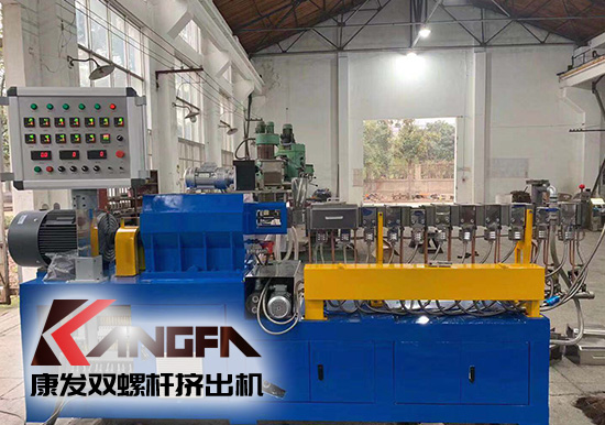35型色母粒專用內(nèi)置水路、真空系統(tǒng),PLC控制柜雙螺桿擠出機,質(zhì)檢部嚴格試機過程中
